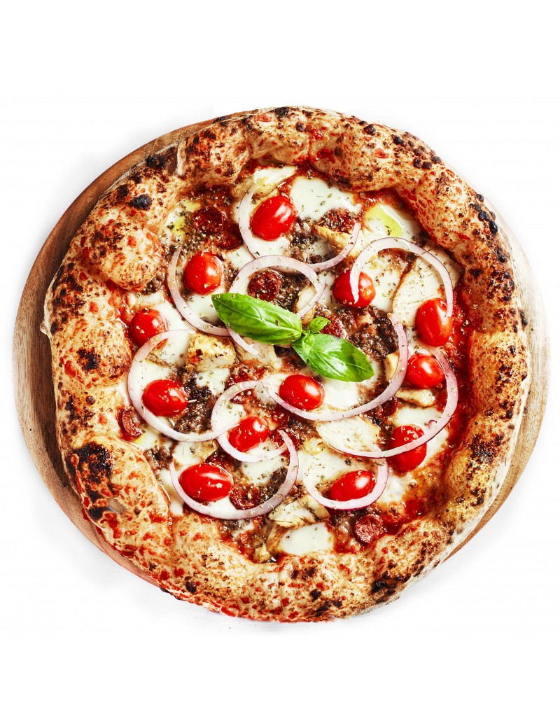 Sauce tomate, mozza, viande de boeuf hachée, émincés de poulet mariné, merguez du boucher, tomates cerises et oignons rouges